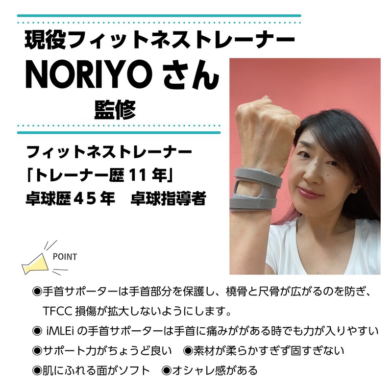- 【フィットネストレーナー監修】卓球歴40年・卓球指導者・フィットネストレーナー歴11年のNoriyoさん監修。自身も腱鞘炎の手首の痛みがあり,サポーター 手首用を色々試し探しましたが、iMLEiの手首 サポータを監修しました。リストバンド仕様で手首可動域を邪魔しないのでレッスン中、プライベートでも毎日着用しています。マウスパッド 手首 指 サポーターとしても良いですね。外さずに手洗い可能で蒸れにくい構造なので着けたまま一日中快適に過ごせると大満足しています。