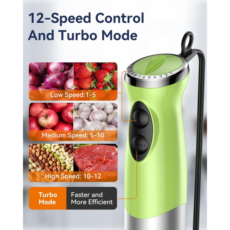 - 1000W Powerful Blending: The food blender (batidora de mano electrica) features a powerful awesome 1000-watt blending power and turbo boost mode, which would be a time saver when making soups, sauces, homemade salad dressings for meal prep or making smoothies and milkshakes with healthy natural raw ingredients - ideal for quick meal prep and various kitchen needs.