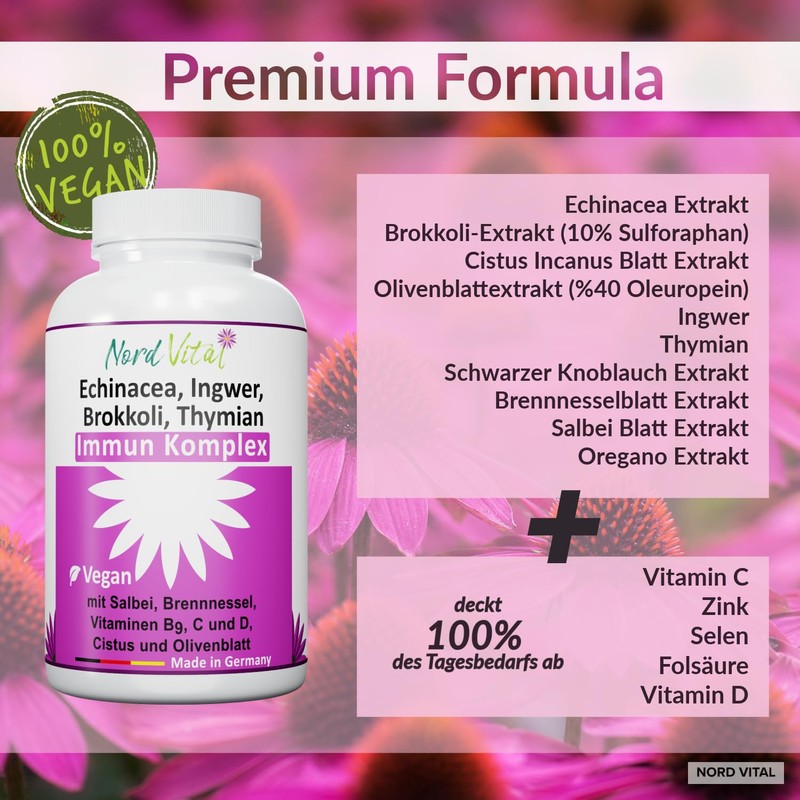- Thoughtful concept: the main plant ingredients echinacea, broccoli, olive leaf, cistus, ginger, sage, nettle, black garlic, thyme and oregano are supplemented by zinc, selenium, folic acid, vitamin D and vitamin C, which have been proven to contribute to the normal functioning of the immune system.
