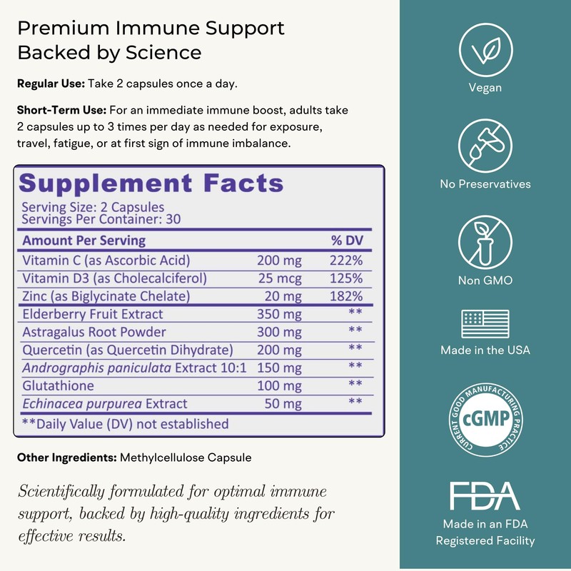 - Comprehensive Immune Support: Fortify your natural immune defense this winter with our all-in-one synergistic immunity booster formula, featuring a comprehensive blend of vitamins and botanicals including Zinc Vitamin C Vitamin D, Black Elderberry, Quercetin, Glutathione, Andrographis, Astragalus, and Echinacea