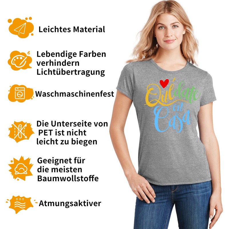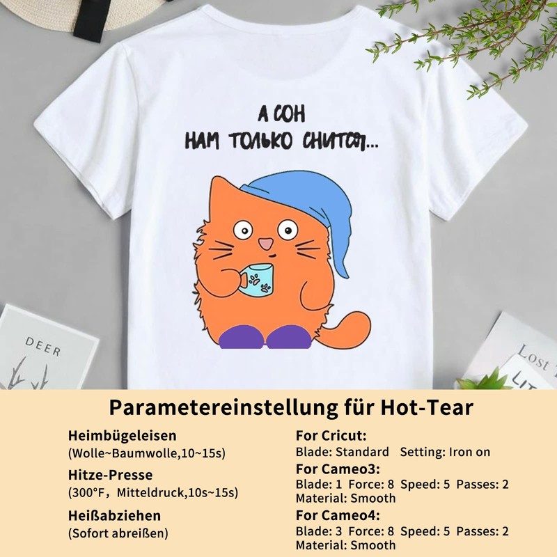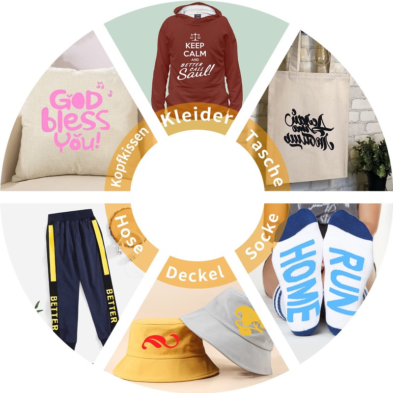 • Warm exfoliation without waiting time - transfer it to your target with a heat press or iron. Apply pressure at 300°F - 320°F (150°C - 160°C) for 10-15 seconds. You don't have to wait for the film to cool completely, but you can peel off the entire back immediately after ironing. Our textile plotter film is wide enough for large graphics and compatible with all Cricut machines.