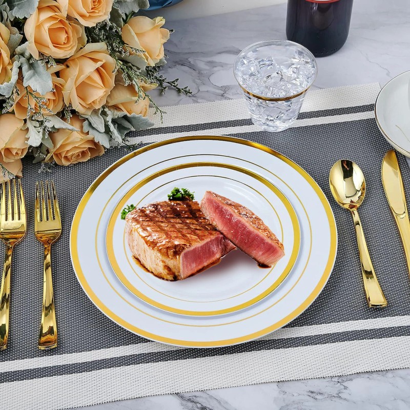 iMounTEK 175pcs Disposable Dinnerware Set Gold Plastic Plates for Wedding Birthday Party