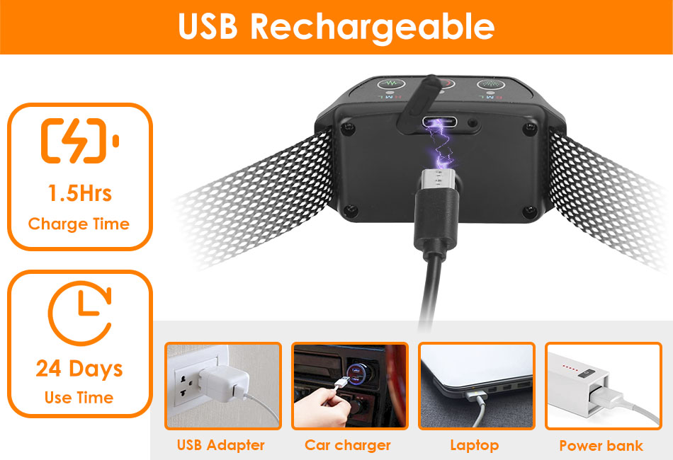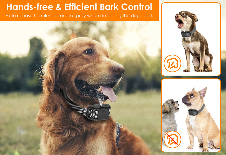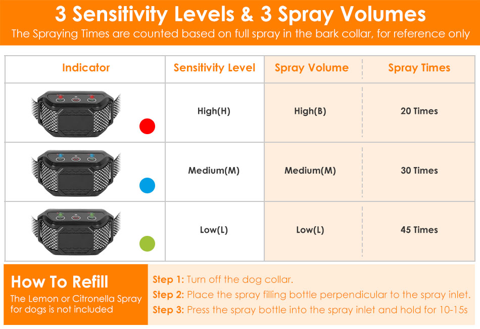 Feel distressed when your dog barks? Also worried that the static shock may hurt your dog’s neck? Our citronella bark collar can automatically release harmless citronella spray when detecting the dog's bark, stopping unwanted dog barking or correct misbehavior, especially to protect the puppy dogs. No electric shocks, no pain for dogs. The 3 adjustable sensitivity levels and spray volumes enables you to choose the most suitable combination for your furry friend. Keep standby for 24 days after 1.5 hour’ fast charging. IP65 waterproof and suitable for small, medium, and large dogs. Features: