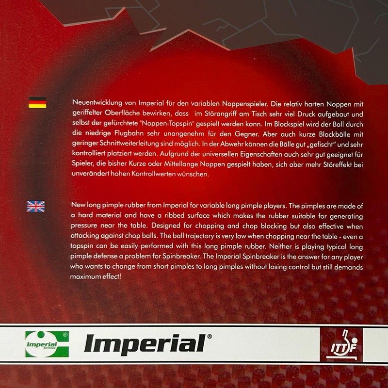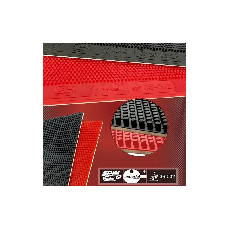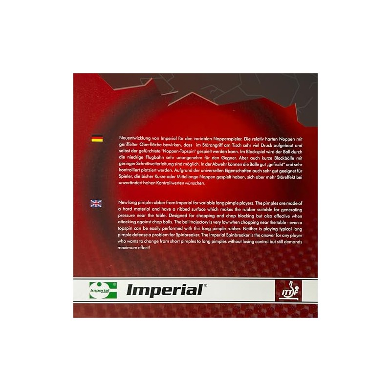 Special development from Imperial for the variable pimple player. The relatively hard nubs with ribbed surface mean that a lot of pressure can be built up in the disturbing attack on the table and even the dreaded "pimple topspin" can be played. In the block game, the ball becomes very unpleasant for the opponent due to the low trajectory. But short block balls with low cutting transmission are also possible. Due to the universal properties, it is also very suitable for players who have previously played short/medium length nubs, but want more disturbing effect with unchanged high control values.