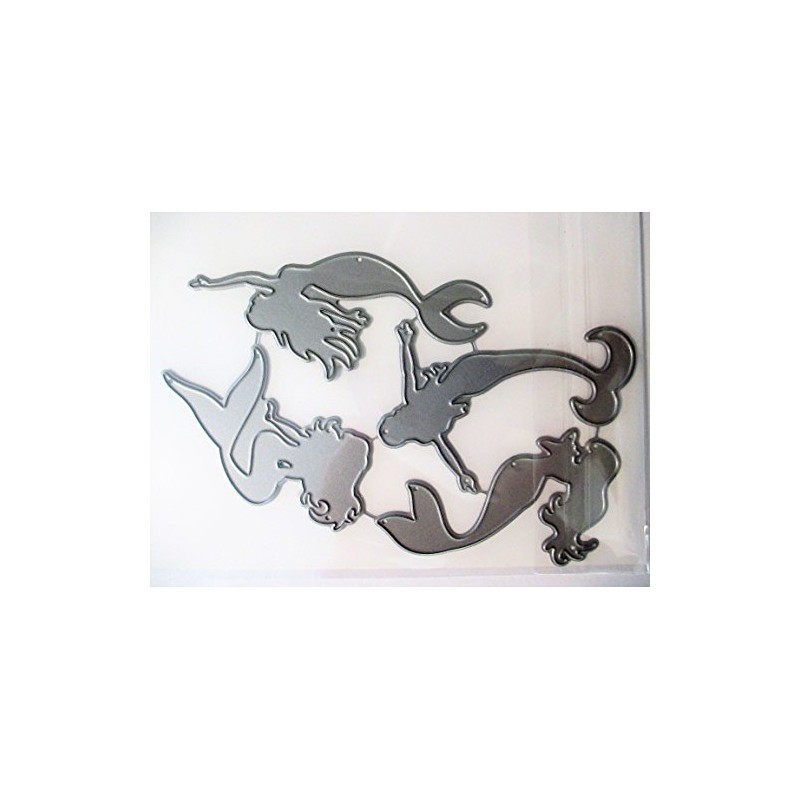 Mermaids steel die for scrapbooking by Impression Obsession. This is a set of 4 dies. The mermaids measure 1-1/2 x 2-1/8 inches, 1-1/4 x 2-3/8 inches, 1-1/4 x 3 inches, and 1-3/4 x 2-1/2 inches. Some of the more detailed dies require extra care to achieve the best results. Additional shims may be necessary and some machines handle the detail level better than others. If you are using a Cuttlebug with very detailed dies, we recommend using a metal adapter plate for best results. The metal plate also works well with other machines and the very detailed dies.