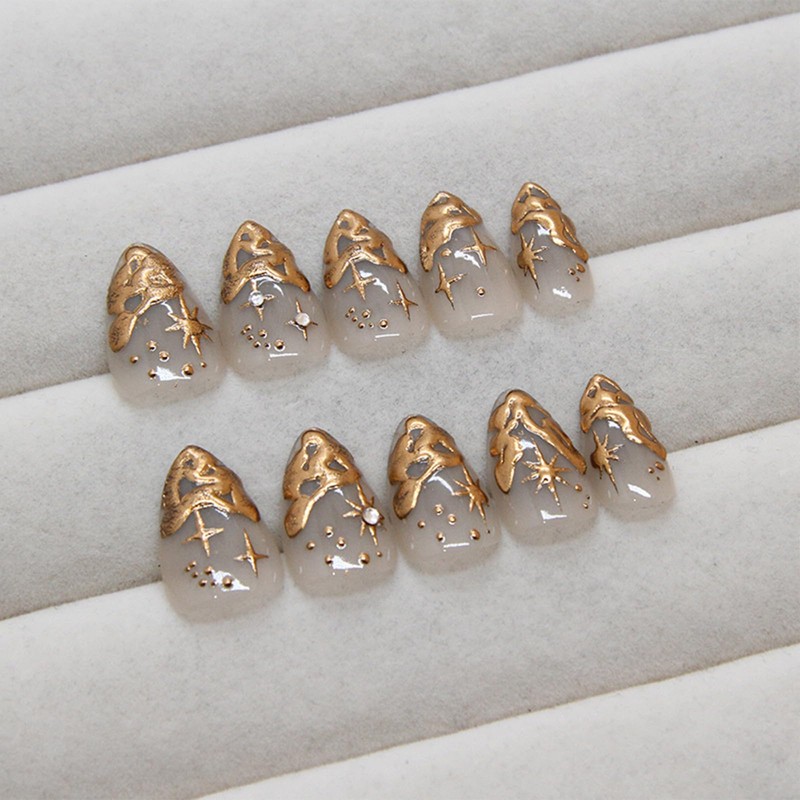 IMRAIN Press on Nails Medium Almond 3D Golden French Tips Fake Nails Glossy Glue on Nails with Star Designs Full Cover Artificial Acrylic False Nails Reusable Glue Stick on Nails for Women