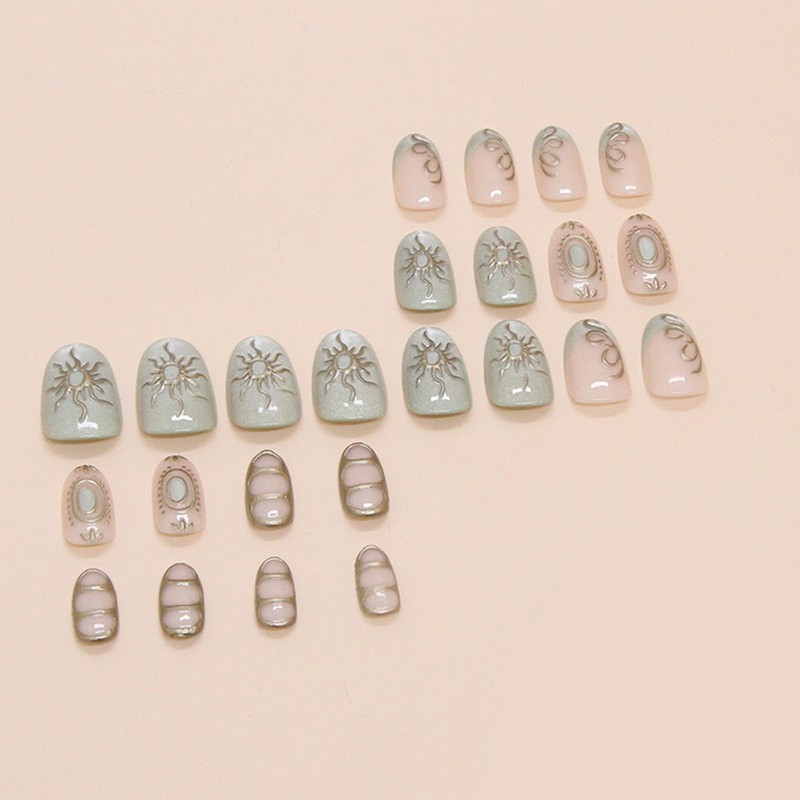 - [Quality Material] These green cat eye & golden sun press on nails are made of quality acrylic material, gentle to your nails and skin, not easy to be scratched, will give you a nice manicure experience.