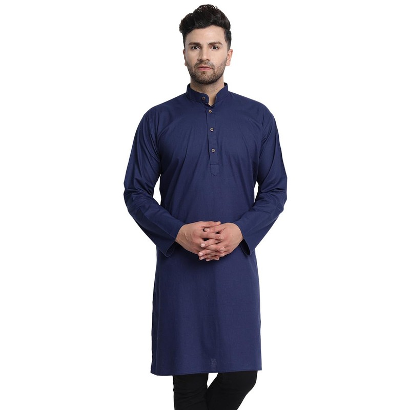 In-Sattva Men's Indian Banded Classic Collar Pure Cotton Long Kurta Tunic; Navy; LG