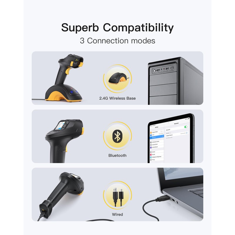 - Wide Compatibility Pro 8 supports both Bluetooth and 2.4G connections, suitable for Windows, Mac OS, Linux, Android and iOS systems. Three types of feedback: light, vibration and sound. Suitable for various scenarios such as warehouses, logistics centres and supermarkets. You can also easily set up the scanner via the app or screen