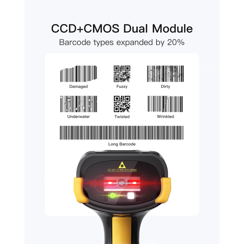 - Larger reading range: the Pro 8 uses CMOS CCD double modules, which are able to detect small high density barcodes and all common long 1D barcodes, such as B. Code128 barcodes up to 99 bytes/316 mm