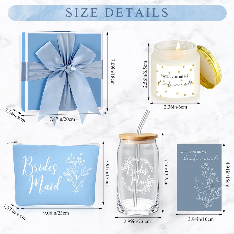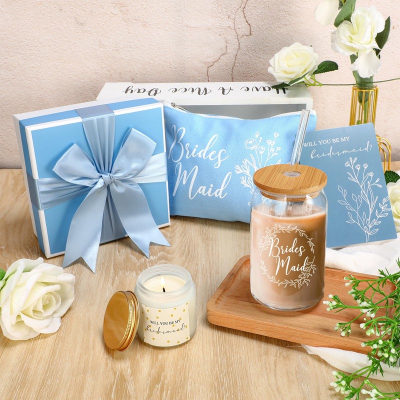 - Package Includes: the bridesmaid gifts set includes 1 wedding party cosmetic bag, 1 sage scented candle, 1 glass cup with bamboo lids and glass straw, 1 proposal card and 1 gift box, a complete combination for you to prepare the bridesmaid gifts for wedding day or bridal shower
