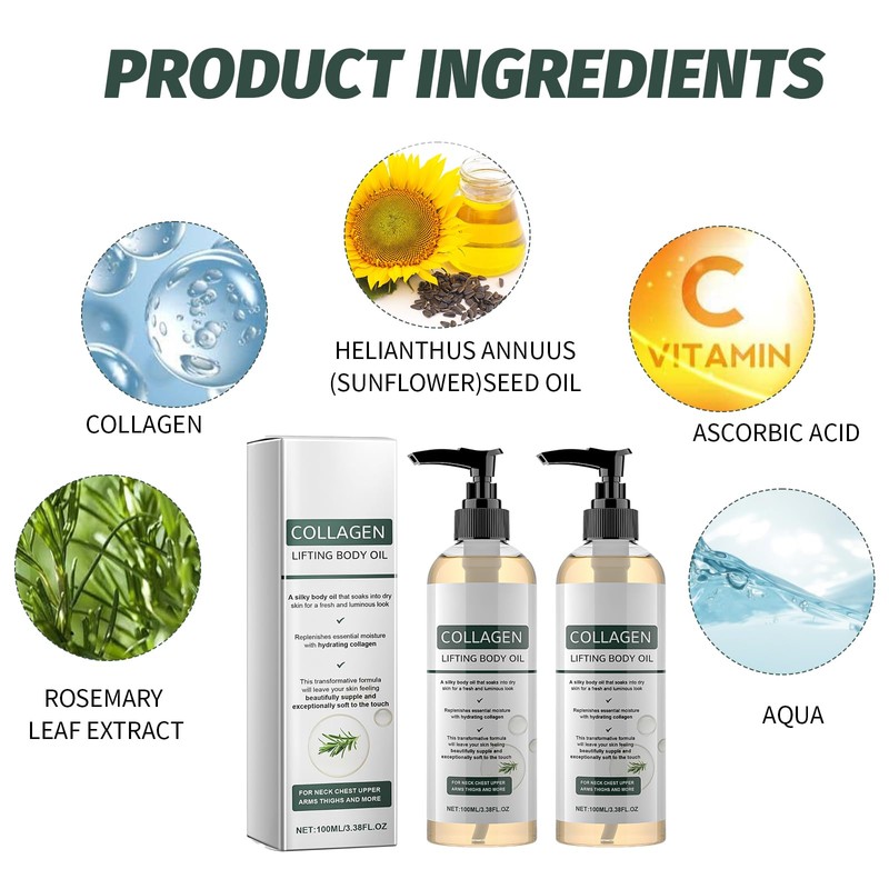 Specifications:Name:Collagen magic body oil firmingProduct ingredients:Water, vitamin C, collagen, sunflower seed oil, rosemary leaf extractWeight: About 134gSize: 4*15cmCapacity: 100ml/bottlePackage content: 2 * Collagen body oilDescription:Deep hydration and firming, magic body oil can deeply nourish the skin, improve dryness and enhance elasticity, making the skin look younger.Natural ingredients are safe and non-irritating. Glowessence magic oil is made of plant extracts and is gentle and suitable for all skin types.Innovative press bottle mouth design, accurately control the amount of magic luxury body oil, reduce waste while keeping the product clean and pollution-free.The texture of firm skin magic body oil is moisturizing and easy to penetrate. It is quickly absorbed by the skin after application, and will not easily leave a sticky feeling or clog pores.Magic body oil firming cellulite not only moisturizes and nourishes, but also effectively relieves stretch marks and uneven skin tone, meeting diverse skin care needs.How to use:Clean body skin and keep it dry.Take an appropriate amount of this product on the palm of your hand and apply itevenly on the body.Gently massage in a circular motion untilfully absorbed.