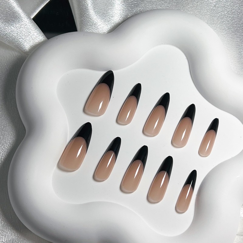INCHIC Elegant Noir, Extra Long Almond, Nude Shade with Black Accents French Tip, 30 Pcs Press on Nail