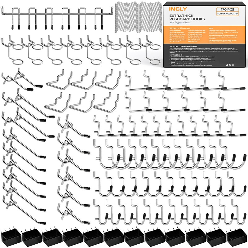 INCLY 170PCS 1/4 Inch Pegboard Hooks Kit, Extra Thick Heavy Duty Peg Board Or...