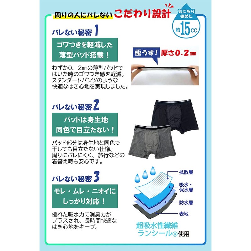 Incontinence Pants, Men's, Urinary Leak Pants, Boxer Shorts, Absorbent Pads, Toyobo Lancel Pat, High Performance Water Absorption Pants, Antibacterial and Odor Resistant, Cotton, Plain, Open Front,