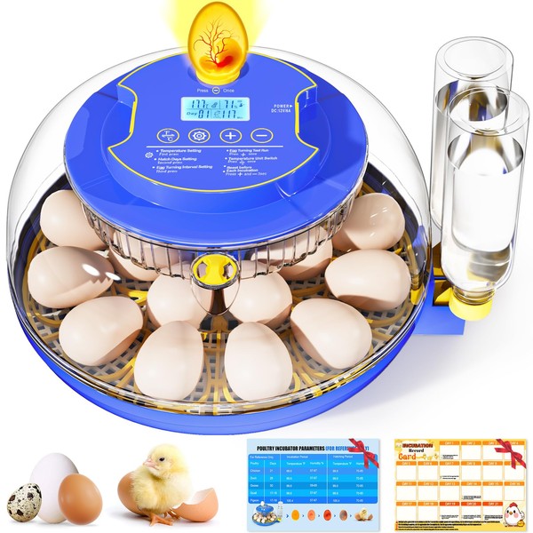 - 【Automatic Egg Turning】This upgraded 18-egg incubator includes an automatic turner with adjustable cycles (60-180 min), ensuring even heat distribution and higher hatch rates. The 360° clear window and built-in egg candler let you monitor embryo development at any time.