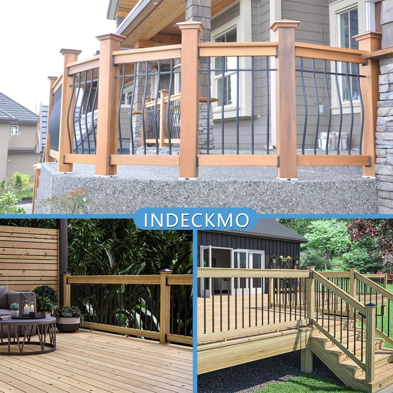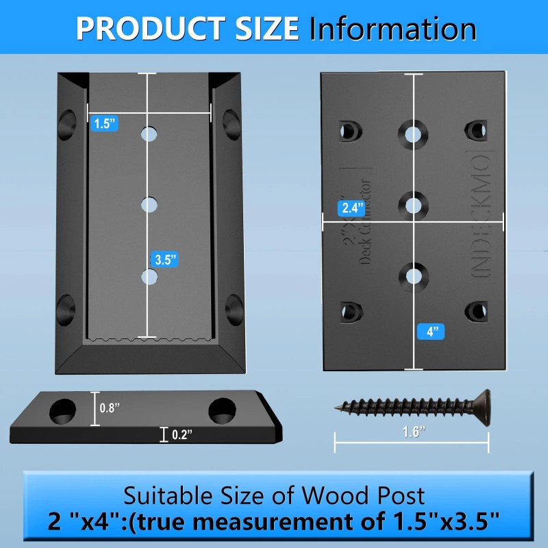 【Adapted Size】INDECKMO 90 Degree Railing Connector is suitable for 2" X 4" inches (actual size 1.5" x3.5") or 2" X 6" (actual size 1.5" x5.5") wood railings. NOTE that sanding is required for the wood to fit the deck brackets if your wood is slightly larger.