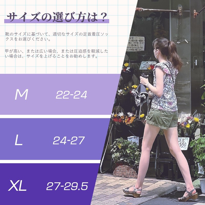 - 【How to choose the size of compression socks? Available in 3 sizes: M, L, and XL. Depending on the size of the shoes, the M is compatible with 22-24, and the L is 24-27, and the XL is 27-29.5. If you have a wide or high instep or you are in between sizes, we recommend ordering a larger size