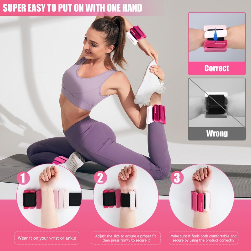 INDEPANDIA Ankle Wrist Weights for Women Men at Home Set of 2 (2Lbs Each) Adjustable Silicone Hand Leg Weights Wearable Pilates Ankle Weights for Yoga Dance Gym Workout Walking Running Pink