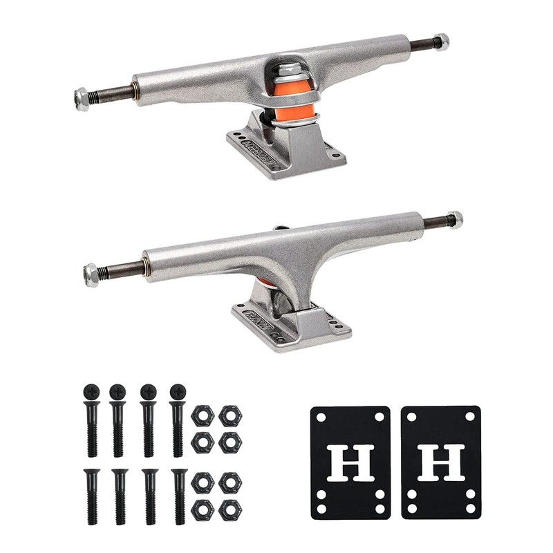 - Includes everything you need to mount these skateboard trucks to a skateboard deck. Includes 2 Independent Trucks, Includes a set of 2, 1/8" polyurethane riser pads, and 1" Mounting Hardware from Dime Bag Hardware.
