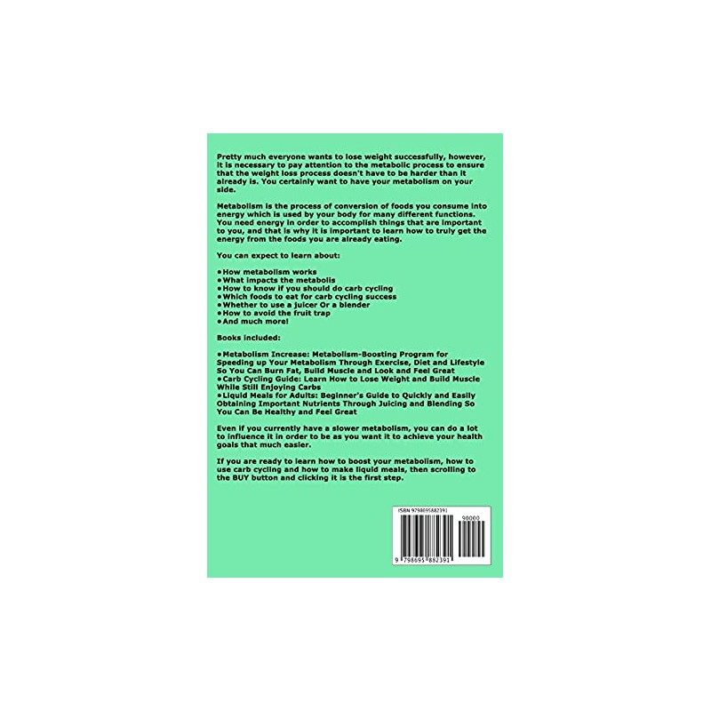 Buy the Paperback version of this book and get the eBook version included for FREE Pretty much everyone wants to lose weight successfully, however, it is necessary to pay attention to the metabolic process to ensure that the weight loss process doesn't have to be harder than it already is. You certainly want to have your metabolism on your side.Metabolism is the process of conversion of foods you consume into energy which is used by your body for many different functions. You need energy in order to accomplish things that are important to you, and that is why it is important to learn how to truly get the energy from the foods you are already eating.You can expect to learn about:?How metabolism works?What impacts the metabolism?How to know if you should do carb cycling?Which foods to eat for carb cycling success?Whether to use a juicer Or a blender?How to avoid the fruit trap?And much more!Books included:?Metabolism Increase: Metabolism-Boosting Program for Speeding up Your Metabolism Through Exercise, Diet and Lifestyle So You Can Burn Fat, Build Muscle and Look and Feel Great?Carb Cycling Guide: Learn How to Lose Weight and Build Muscle While Still Enjoying Carbs?Liquid Meals for Adults: Beginner's Guide to Quickly and Easily Obtaining Important Nutrients Through Juicing and Blending So You Can Be Healthy and Feel GreatEven if you currently have a slower metabolism, you can do a lot to influence it in order to be as you want it to achieve your health goals that much easier.If you are ready to learn how to boost your metabolism, how to use carb cycling and how to make liquid meals, then scrolling to the BUY button and clicking it is the first step.