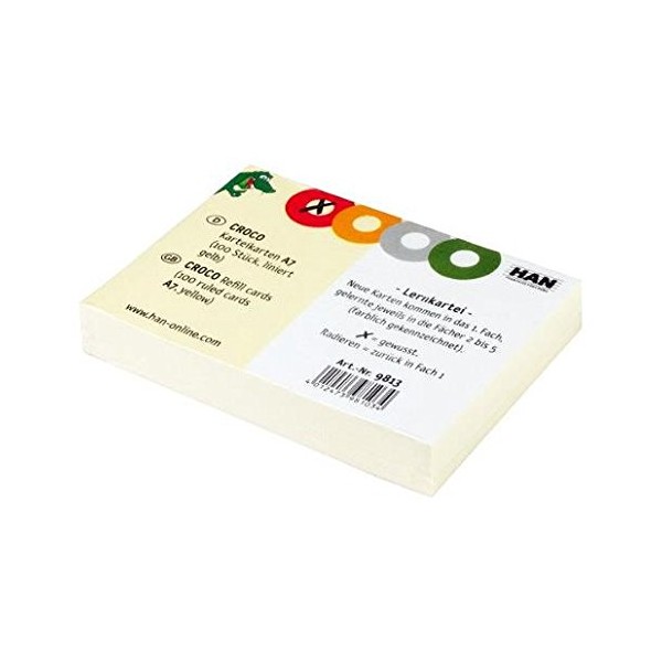 Index cards for Croco DIN A7 landscape. Sturdy index card. For more system when learning! Includes 4 colourful tick circles for learning success with guarantee. Chlorine-free bleached. Card format: DIN A7 landscape. Packed in foil of 100 sheets. Made in Germany. Material: index card 190 g/m². Line colour: grey. Card colour: yellow.