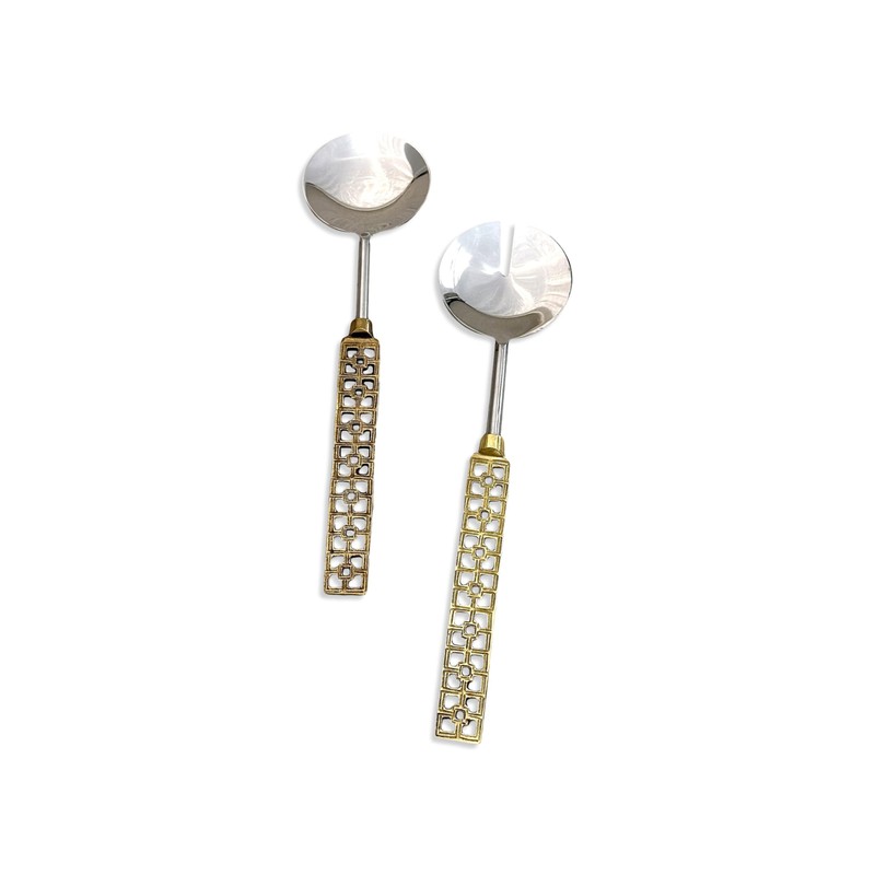 India Handicrafts Trellis Cut-Out Handle, Antiqued Gold/Silver Tone 11.2 Inch Stainless Steel Salad Server Set, 75082