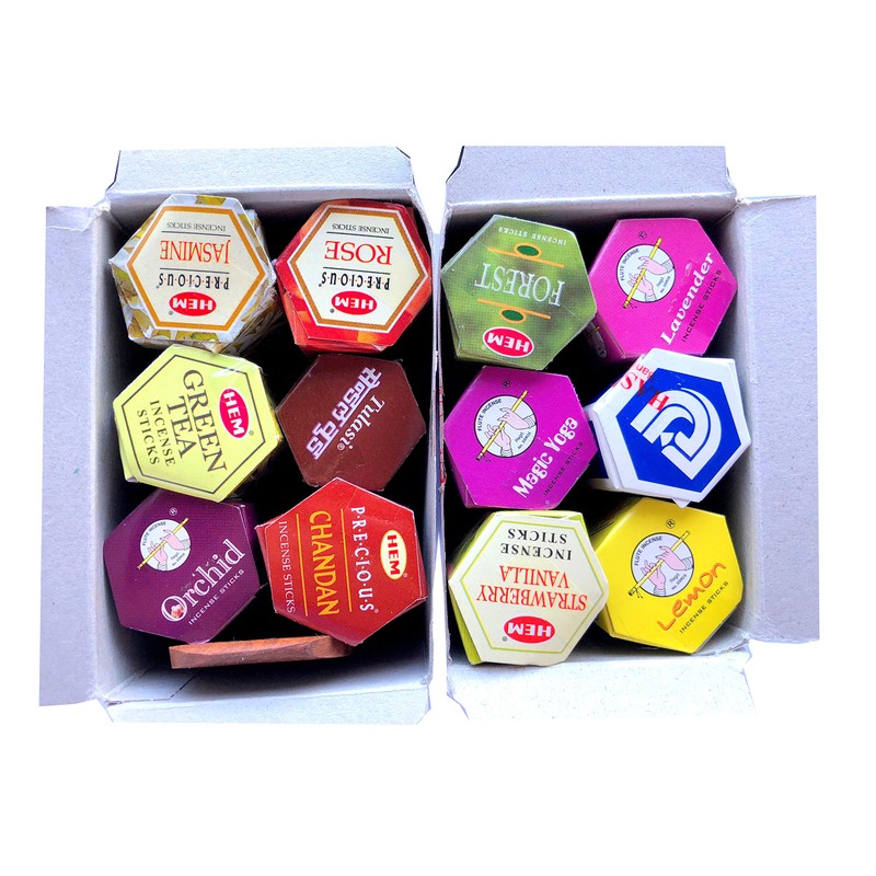 12 popular scents including HEM Chandan, Denim, Green Tea, Rose, Jasmine.