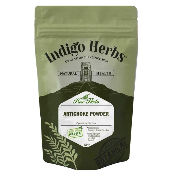 Artichoke Leaf Powder 100g from Indigo Herbs is derived from the highest quality Artichoke leaves. This herbal powder is rich in the fibre "inulin" which supports healthy digestion and contains vitamins, minerals and antioxidants. This easy to use powder can be incorporated into smoothies, savory dishes, encapsulated or mixed with a little water.