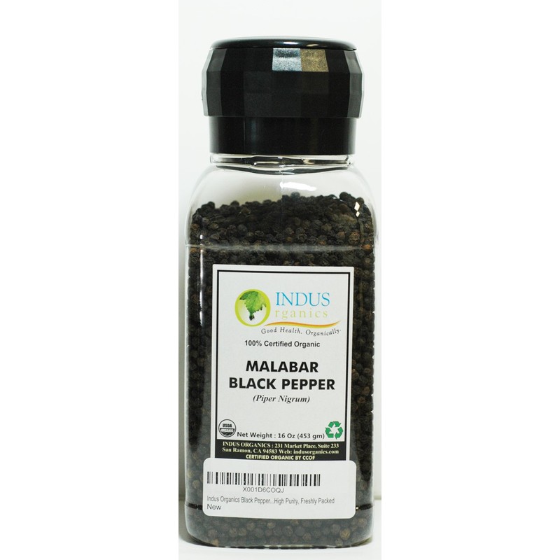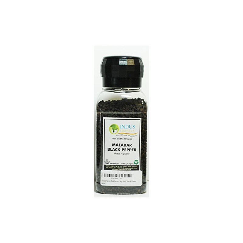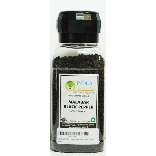 Indus Organics Malabar Black Peppercorns, 16 Oz (2 x 8 oz) Jar Grinder, Premium Grade, High Purity, Freshly Packed