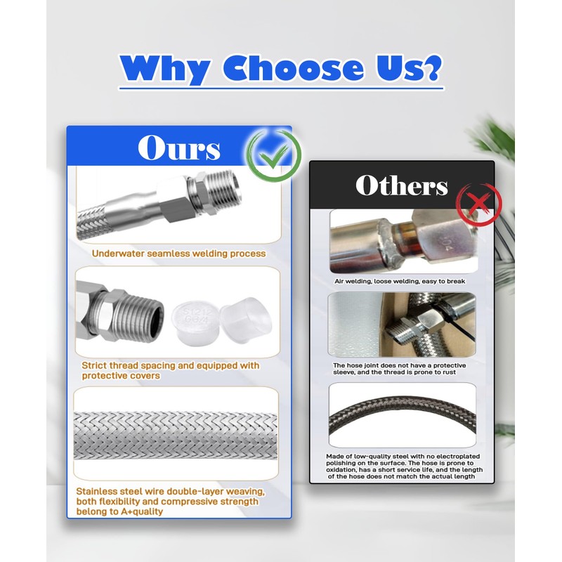 - 【TECHNOLOGY】:The compressor hose is made of stainless steel braided fabric and corrugated stainless steel. The hose and joint are connected by underwater welding to ensure the sealing of the hose,and are ground and polished to make the overall structure of the product sturdy and beautiful.