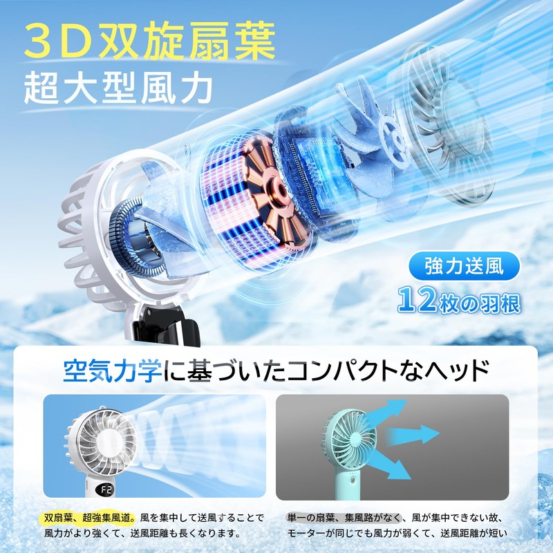 - Double fan leaf design, 12 blades, super fast and large air flow, 5 levels adjustable air flow: Adopts an innovative twin turbo design, and the 12 blades and double fan leaf leaf design, compared to conventional products, it has a 50% more wind power than 5 blades of the same type portable fans, and the speed of rotation is faster, allowing you to blow strong wind. By raising wind near your face, you can lower your body temperature and keep you comfortable on cooler and hot days. Simply press the button on the fan to adjust the airflow volume to 5 levels, and you can freely adjust the desired wind power according to the scene. The low and medium wind mode is ultra-quiet and can be used comfortably at work or in the library. In addition, the strong, ultra-strong, and strongest wind modes allow the wind to be blown out, and you can feel cool even if you are 7.9 inches (20 cm) away