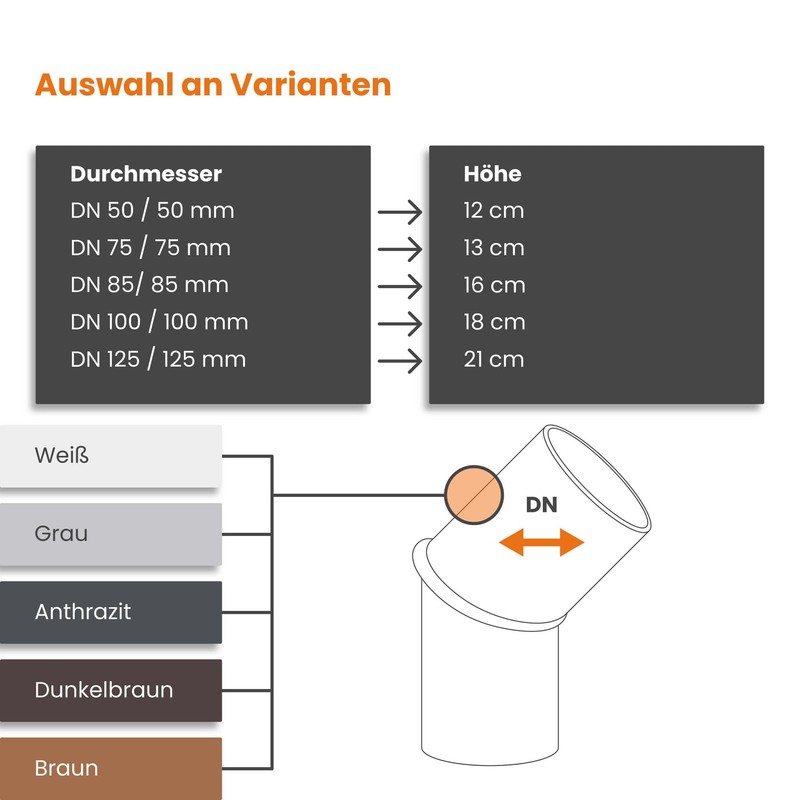 The 45° pipe bend is an accessory of our rain downpipe and allows the perfect connection of the drain with the gutter. With the pipe elbow, two downpipes of the same size or the gutter drain pipe can be aligned at a 45° angle to each other and the water drainage can be varied as desired. The product is made of high-quality, plasticiser-free PVC-U plastic and is characterised by special dimensional stability and UV resistance.