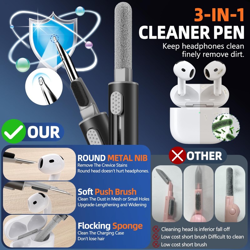 - 【Cleaning Pen-shaped Design】Convenient Double-head hidden design,The tip of the cleaning pen, which can clean the small hole of the earplug, and deeply clean the gap and stubborn dirt. There is a soft microfiber brush under the pen tip,which can easily brush away the tiny part of the headset surface. cleaning pen will meet the cleaning needs of many situations. Suitable for Aiprod 4TH Bluetooth earbuds, headsets, mobile phone, computer, tablet, camera and other digital products.