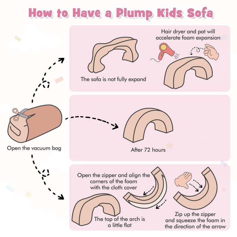- NOTE: As the product material is made of high density sponge and flannel fabric, vacuum compression packaging. Once the kid's couch set is opened, please wait 24-48 hours for the sponge to bounce back before using. If after 48 hours, found that the fabric of the product is wrinkled, using steam ironing can restore the fabric smooth.