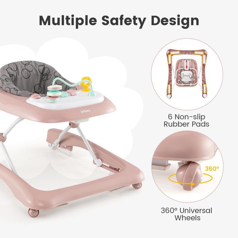INFANS foldable Baby Walker, a versatile and safe option for your little one's early steps! This walker transforms into 3 different modes - a baby walker, a fun-filled activity center, and a secure push-along toy. This 3-height adjustable baby jumper supports their development at every stage. Safety and comfort are INFANS top priorities. The walker for infant features a stable base and 6 anti-slip pads, providing excellent balance to prevent accidental tipping. The washable padded seat offers maximum comfort, allowing your baby to explore and play for extended periods without discomfort. Additionally, activity walker designed with interactive toys, stimulating baby's senses and encouraging cognitive development.