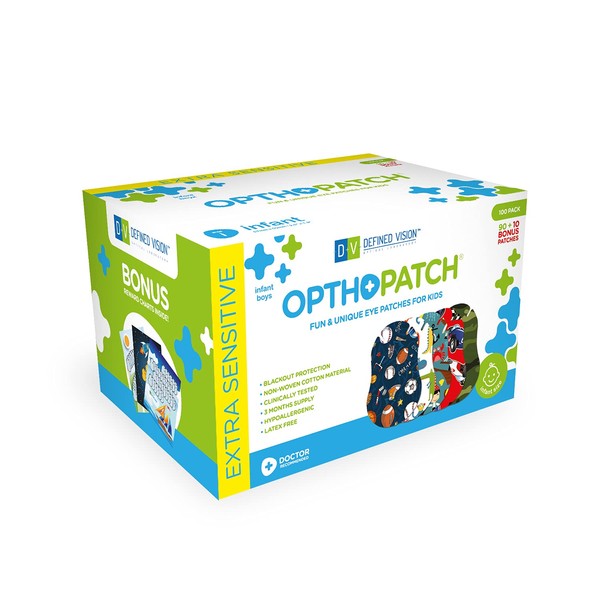 - COMFORTABLE, BREATHABLE & FUN: OpthoPatch Infants' eye patches are made from non-woven cotton material that allows the skin to breathe. Cool boys’ designs make them fun to wear, too! SIZE: 67 mm X 50 mm (2.63" X 1.96"). Also available in kids' size (83 mm X 57 mm) and trendy designs for girls.