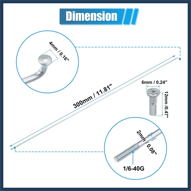 - Simple: Dimensions: Spokes Size: 305x7mm / 12.01"x0.28"(L*W), Spokes Shaft Dia.: 2mm / 0.08", Thread Size: 1/6-40G, Elbow Head Dia.: 4mm / 0.16", Spokes Length(without Elbow): 300mm / 11.81", Nipple Size: 12x6mm / 0.47" x 0.24" (L*D)
