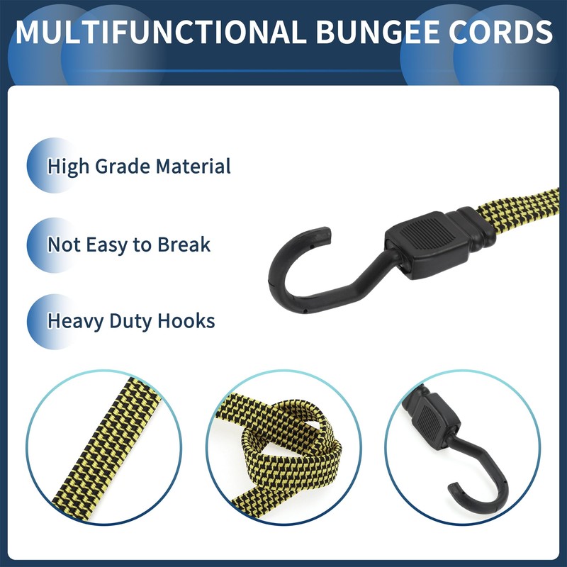 - Universal Fit: These adjustable bungee cords, featuring hooks, are versatile and widely applied in diverse indoor and outdoor environments. Beyond their evident use in attaching heavy items like those on a car's roof or a truck's bed, they effectively secure luggage, tools, and other belongings in position. They stand out for their good length and width compared to standard bungee cords, providing enhanced utility across a range of applications.