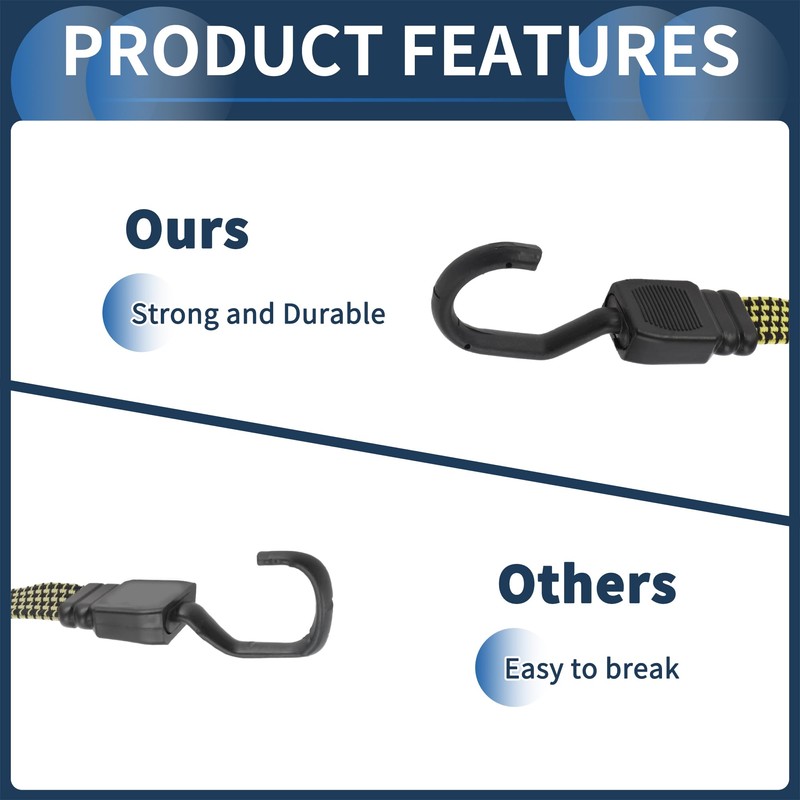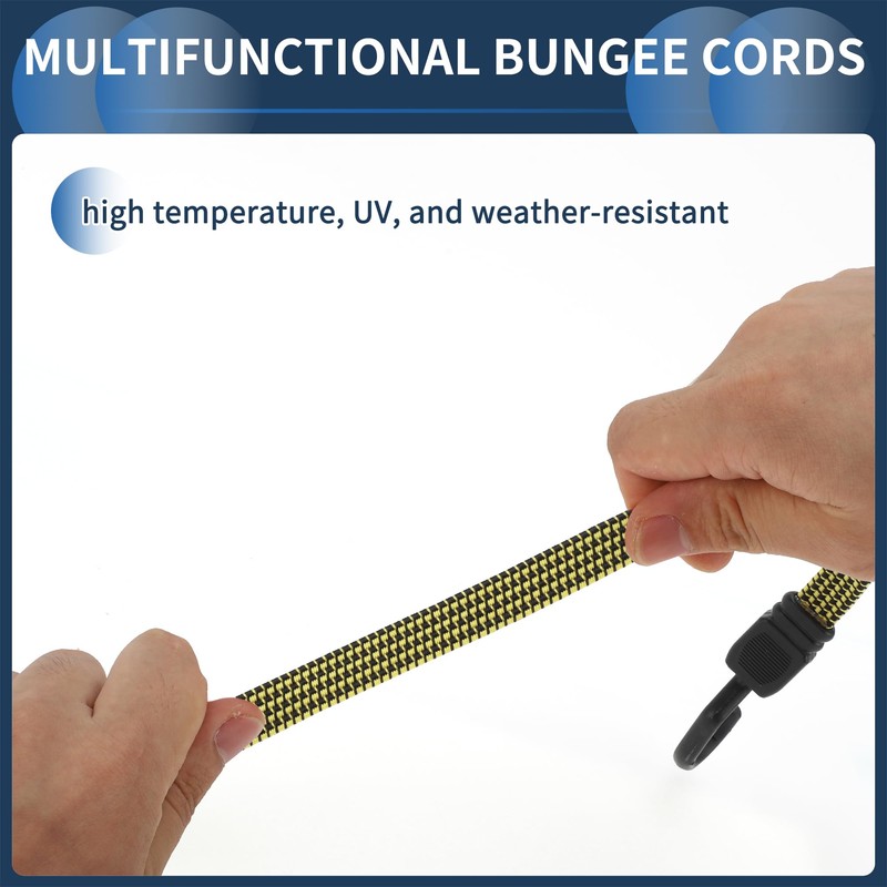 - Product Features: Our heavy duty bungee cords are characterized by their resistance to high temperatures, rays, and adverse weather conditions, rendering them ideal for outdoor pursuits irrespective of the weather. They maintain their flexibility and toughness throughout the year, ensuring durability regardless of the season.