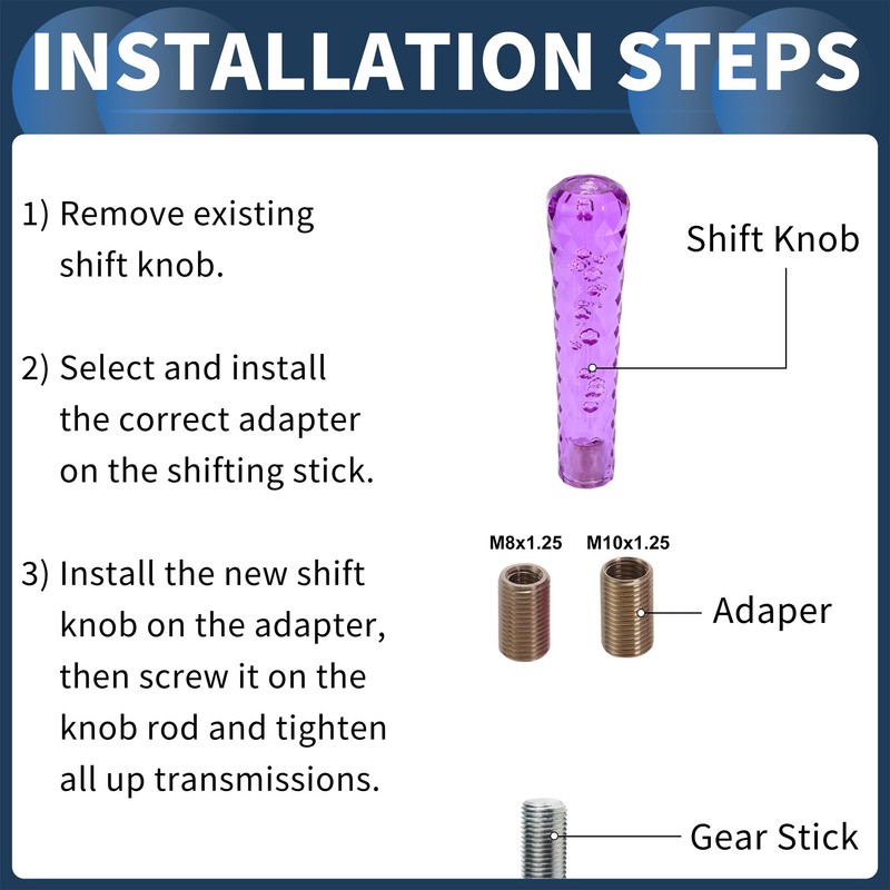 - Installation Steps: 1. Remove the existing gear shift head; 2. Select and install the correct adapter (M8/M10); 3. Install the new gear knob on the adapter; 4. Insert the shift knob rod directly and tighten it to complete the installation.