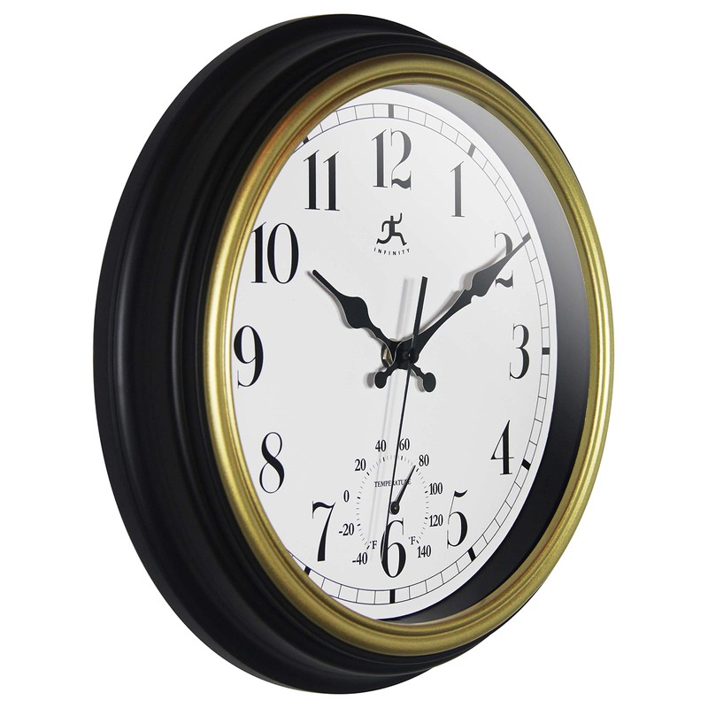 Infinity Instruments Classic Trim Plastic 12" Indoor/Outdoor Wall Clock with Built-in Thermometer, Silent Movement, Black and Gold