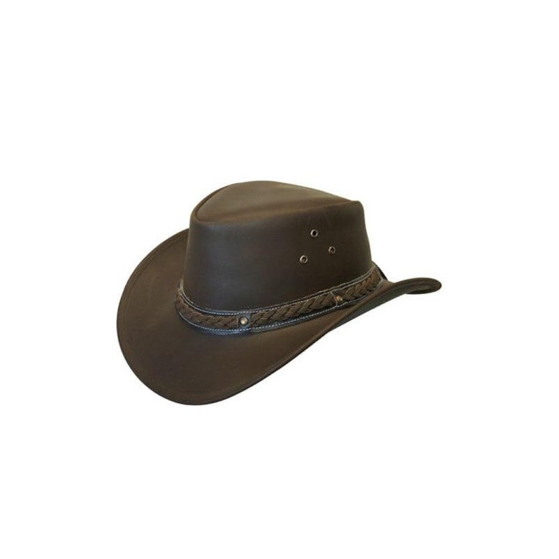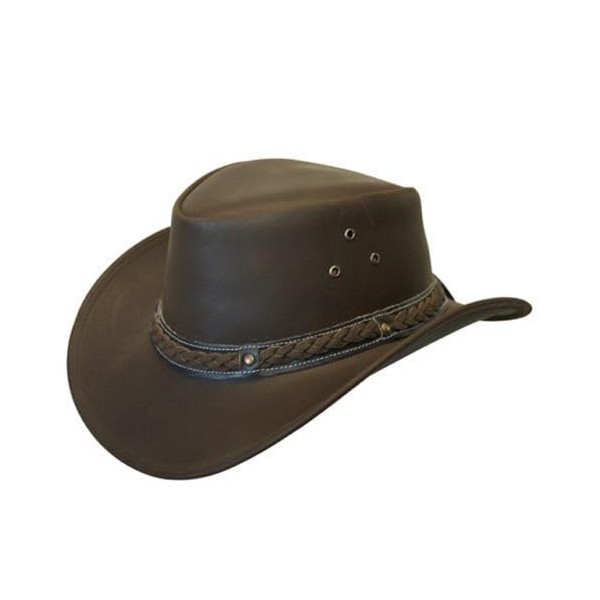 Genuine oiled leather classic western outback. The crown is trimmed with a braided ribbon. Durable yet cool and lightweight with a braided ribbon. Amazing quality. 100% Full Grain, Oiled Leather Premium Quality Craftsmanship Super Value Oiled Leather Moldable Brim Brim: 3"