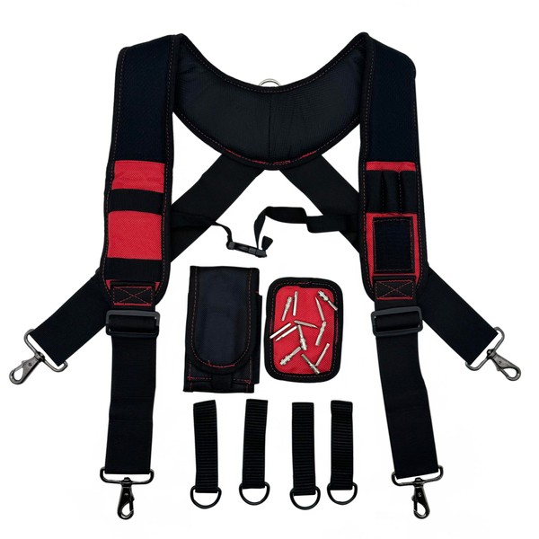 - Tool Belt Suspender: Padded tool belt work suspenders have 1 pocket,1 movable phone holder(Max for 6.1'' mobile phones) 4 loops and 1 magnetic pad. Adjustable front and rear shoulder straps help ensure a comfortable fit. Quick release chest buckle helps secure your tool bundle. We designed a removable magnetic wristband ,to better organize your small items, you don't have to bend over repeatedly to find your screws and small parts.