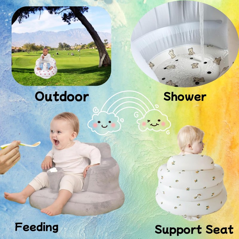 - Multifunctional baby sofa: This baby seat chair is for the floor in your home, bed, bathroom, grass, etc. Baby inflatable seat is ideal for bathing, playing and feeding.