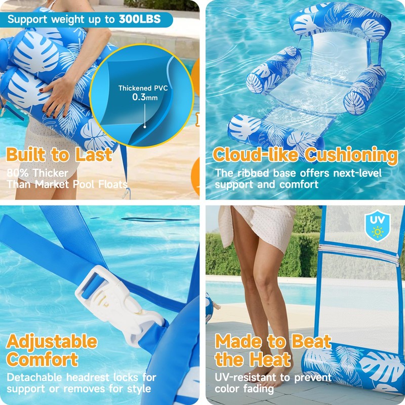 - Ergonomic Headrest & Footrest Design: Crafted for ultimate comfort, this pool float features a supportive headrest and footrest, providing a perfect balance of relaxation and support. It cradles your body in a comfortable, zero-gravity position, making you feel like you're floating on water