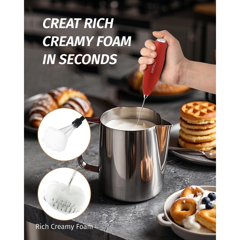 INFOOD Powerful Milk Frother Wand with Stainless Steel Stand and 2 Whisks, Mini Handheld Frother Battery Operated Drink Mixer for Coffee, Lattes, Cappuccino, Hot Chocolate & Egg - Red