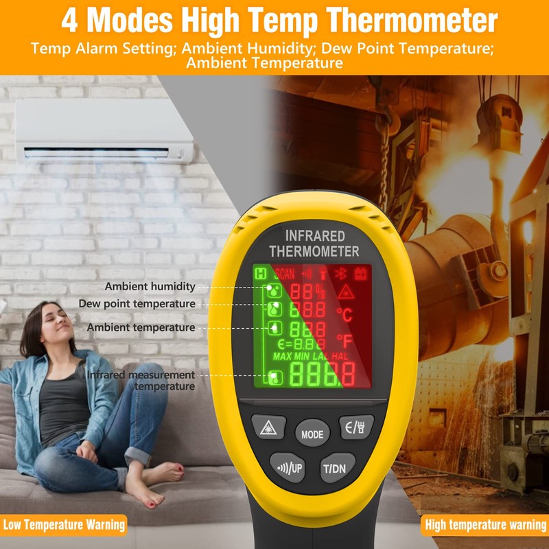 - ✅ 4-in-1 Measurement Functions – Get more than just surface temperature. Also measures humidity, ambient temperature, and dew point—perfect for HVAC troubleshooting, workshop monitoring, and home environment checks.