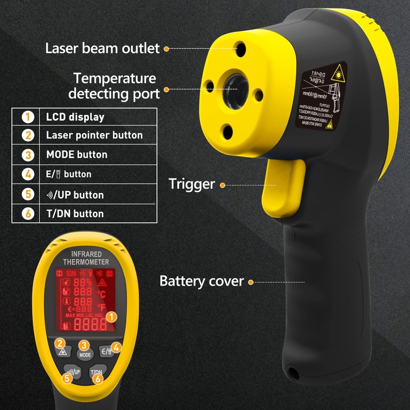 - ✅ Pro-Grade Features – Color LCD display with backlight and flashlight for clear visibility in dark areas. Includes Max/Min recording, adjustable emissivity for different materials, quick °C/°F switch, and auto shut-off for battery saving.