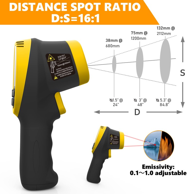 - ✅ Wide Range & High Precision – Accurately measures from -58℉ to 1472℉ (-50℃ to 800℃) with ±2% accuracy. Dual-laser targeting and 16:1 distance-to-spot ratio give pinpoint readings from a safe distance—ideal for both home and industrial use.